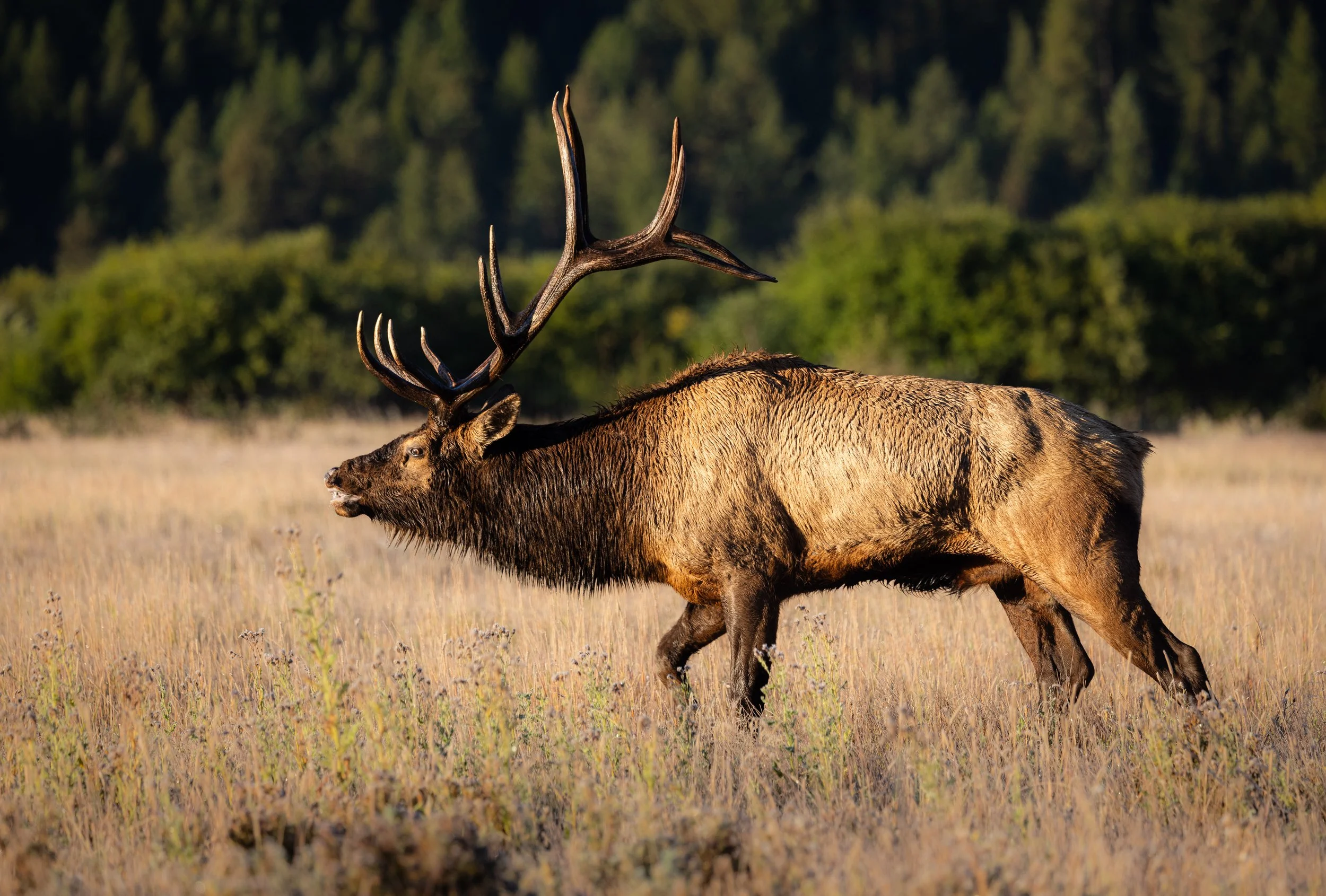 A large elk with impressive antlers walking through a grassy field with trees and mountains in the background.